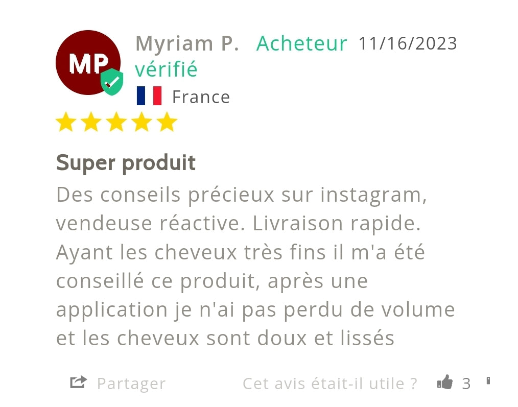 from 2 reviewsAlors deja l'odeur est vraiment agréable et me rappelle les produits sol de janeiro. Ensuite l'efficacité est clairement au RDV j'utilise toutr la gamme er je n'ai jamais eu les cheveux aussi doux merci